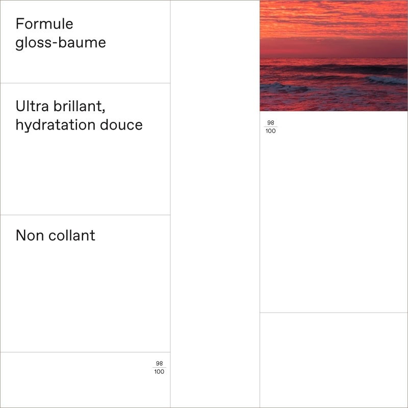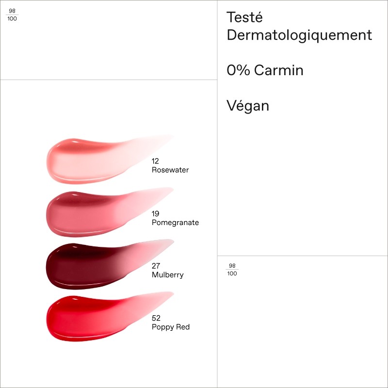 Une formule hybride : le glossy d'un brillant à lèvres et l'hydratation et la nutrition d'une huile pour les lèvres. Apporte un voile de couleur non collant et un fini très brillant. Enrichie en Extrait de Fleur de Grenade et Huile de Ricin, pour un confort dewy et une hydratation douce. Applicateur en silicone pour un résultat facile et parfait.