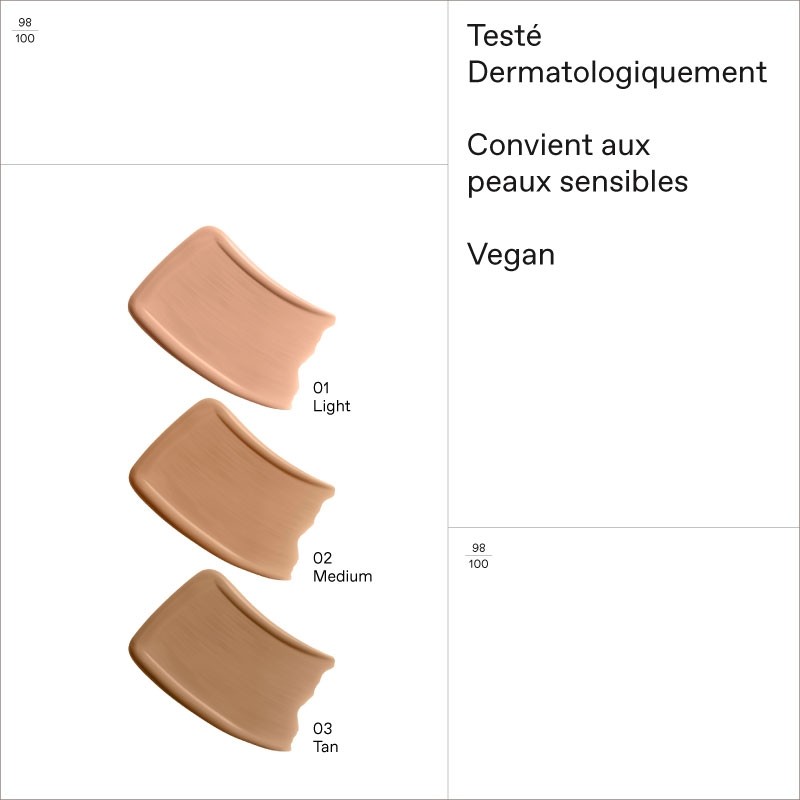 Bien agiter avant usage. Appliquez une petite quantité de fond de teint au pinceau ou aux doigts. Commencez par le centre du visage, puis estompez vers l’extérieur en mouvements circulaires. Pensez à bien fondre la matière au niveau du cou et de la mâchoire pour un résultat homogène.