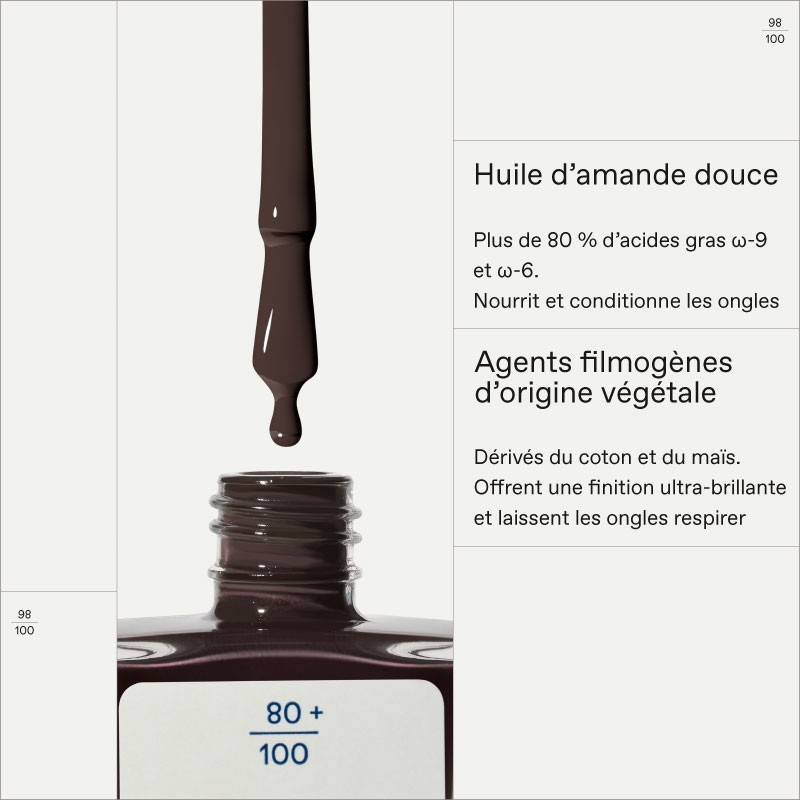FILMOGÈNES VÉGÉTAUX – Dérivés du coton et du maïs. Finition ultra-brillante, tout en laissant respirer l'ongle.