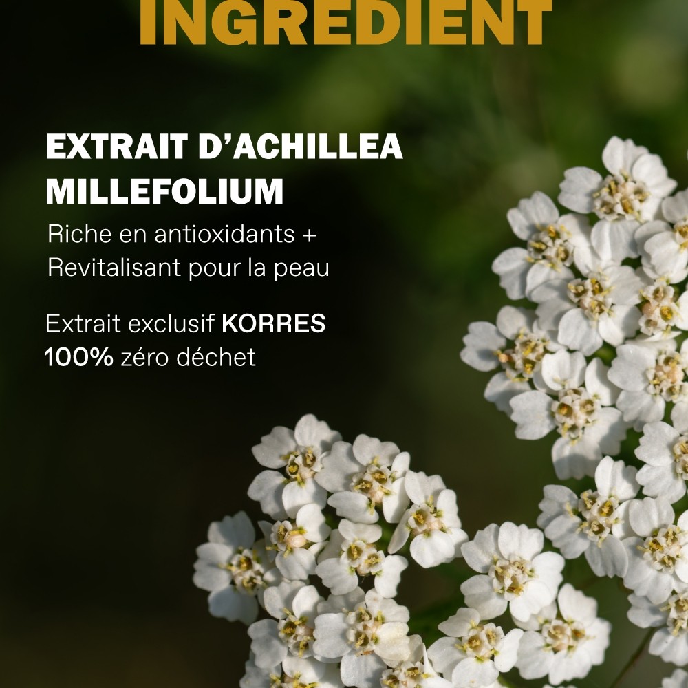 EXTRAIT D’ACHILLEA MILLEFOLIUM : Concentré en antioxydants, pour revitaliser et améliorer la texture de la peau.