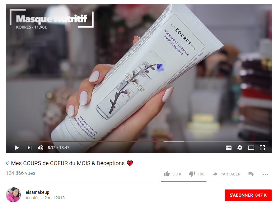 2 Mai 2018Elsa Makeup présente ses coups de coeur du mois, et dans la partie "cheveux" c'est le masque capillaire nutritif Amandes et Graines de Lin KORRES son favoris.