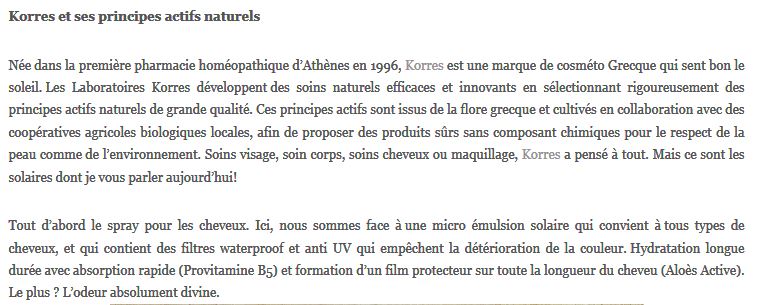 La blogueuse It is all about fashion nous présente ses chouchous solaires pour cet été dont 2 produits Korres : l'huile de protection solaire pour les cheveux à la vigne rouge et la crème solaire visage SPF50 au yaourt (teintée).