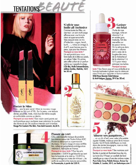 Janvier 2019"L'huile de Rose Sauvage, riche en vitamines C et en acides gras insaturés, fait des merveilles sur les peaux ternes. On la retouve dans ce soin "allume-teint" avec de la fougère des mers, de la rhubarbe et de la vitamines C à 15% pour mieux estomper nos taches. Pourquoi çanous tente? Son flacon pop-art nous emballe et sa formule bi-phasée à glisser sous la crème en extra l'hiver pour apporter un bonus nutrition." Booster bi-phase éclat avancé 41€ les 30ml