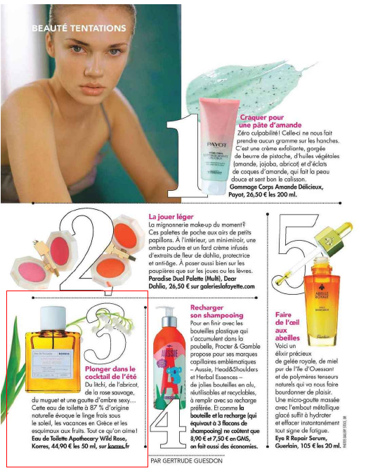 JUIN 2021"Du litchi, de l'abricot, de la rose sauvage, du muguet et une goutte d'ambre sexy... Cette eau de toilette à 87% d'origine naturelle évoque le linge frais sous le soleil, les vacances en Grèce et les esquimaux aux fruits. Tout ce qu'on aime!"