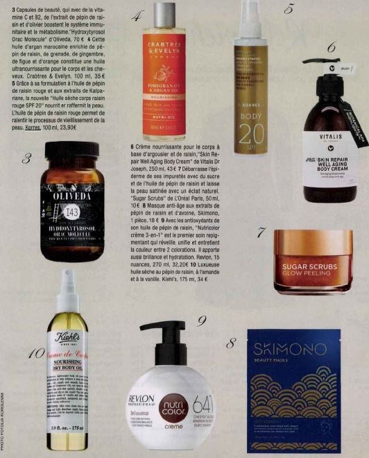 Mars 2018Grâce à sa formulation à l'huile de pépin de raisin rouge et aux extraits de Kalparian, la nouvelle "huile sèche corps Raisin rouge SPF 20" nourrit et raffermit la peau. L'huile de pépin de raisin rouge permet de ralentir la processus de vieillissement de la peau.