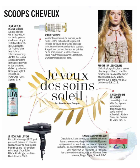 Août 2018"Salade à la feta dans l'assiette, et sur les longueurs, ce shampooing à l'effet éclat immédiat. Sa recette ? De l'huile d'olive bio, riche en vitamines antioxydantes K et E, des extraits tonifiants de feuilles d'oliviers et des protéines de blé hydratantes." Shampooing Brillance Pure Greek Olive, 12,90€ les 250ml
