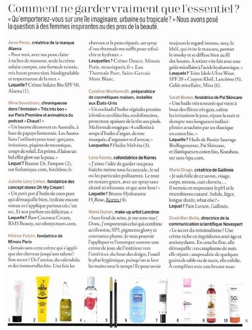 Août 2019Lena KORRES : "J'aime l'idée de garder ma peau fraîche même sous la canicule, le sel ou les particules polluantes. Le tout en restant green, avec un spray sans alcool ni silicones, et qui sent bon!" Brume visage hydratante H2Rose, 21€ les 100ml