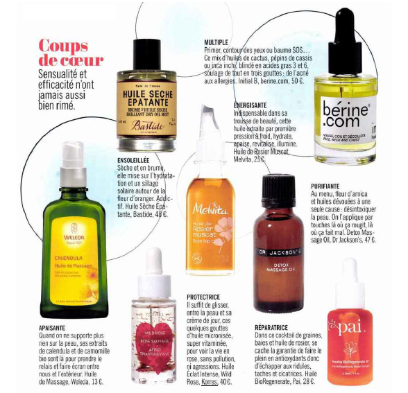 Mars 2019"PROTECTRICE. Il suffit de glisser, entre la peau et sa crème de jour, ces quelques gouttes d'huiles micronisée, super vitaminée, pour voir la vie en rose, sans pollution, ni agressions." Huile Visage Coup d'Eclat 39€ les 30ml