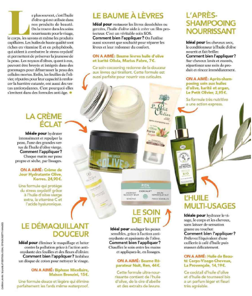 Du 04 au 10 Mars 2019"LA CREME ECLAT. Idéale pour hydrater intensément et repulper la peau, l'une des grandes vertus de l'huile d'olive vierge. Comment l'appliquer ? Chaque matin sur peau propre et sèche, par lissages. ON A AIME: Crème de Jour Hydratante Olive, Korres, 24,90€. Une formule qui protège du stress oxydatif grâce à l'huile d'olive vierge extra, la vitamine C et l'acide hyaluronique." Crème de jour hydratante Olive 24,90€ les 40ml