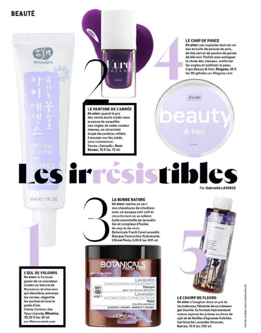 23 au 29 Mars 2018"On aime : s'imaginer dans un pré de lavande sous l'étreinte de ce crémeux gel douche. Sa formule hydratante et nature capture les arômes occitans de spic et de feuilles d'agrumes fraîches." Gel douche Lavande 10€ les 250 ml