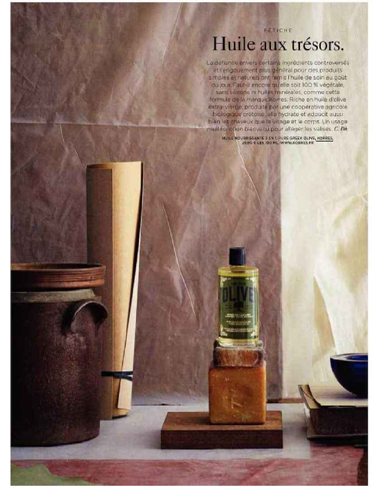 4 Août 2018"La défiance envers certains ingrédients controversés et l'engouement plus général pour des produits simples et naturels ont remis l'huile de soins au goût du jour. Faut-il encore qu'elle soit 100% végétale, sans silicone ni huiles minérales, comme cette formule de la marque KORRES. Riche en huile d'olive extra-vierge, produite par une coopérative agricole biologique crétoise, elle hydrate et adoucit aussi bien les cheveux que le visage et le corps. Un usage multifonction bienvenu pour alléger les valises." Huile nourrissante 3-en-1 Pure Greek Olive, 29,90€ les 11ml
