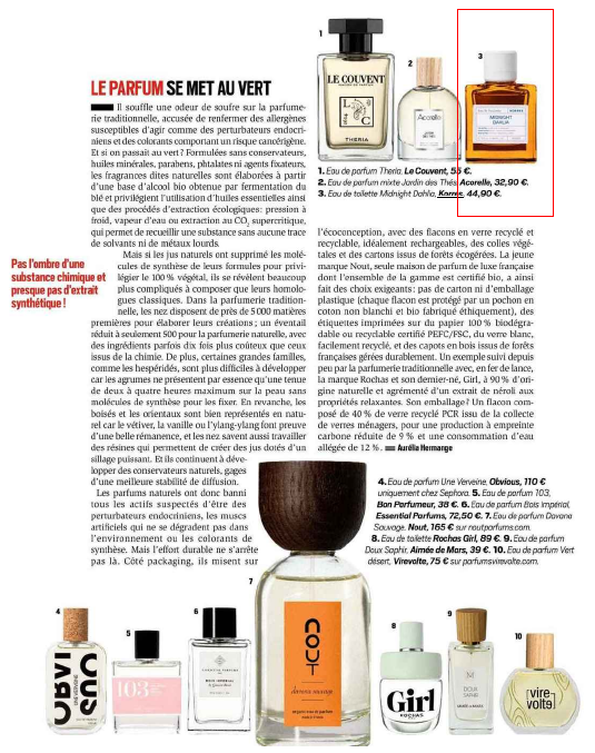 VU dans Paris Match, un article dédié aux parfums qui se mettent au vert. Présentation de notre Eau de Toilette Midnight Dahlia.