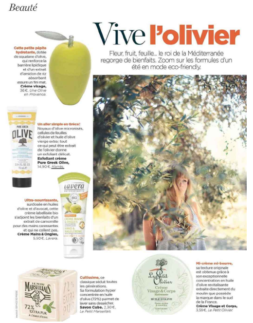 Juillet 2018"Noyaux d'olive micronisés, cellules de feuilles d'olivier et huile d'olive vierge extra : tout ce qui peut être extrait de l'olivier donne un exfoliant délicat" Gommage exfoliant crémeux Pure Greek Olive, 14,90€ les 75ml