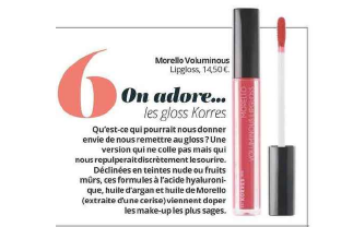 "Qu'est-ce qui pourrait nous donner envie de nous remettre du gloss ? Une version qui ne colle pas mais qui nous repulperait discrètement le sourire. Déclinées en teintes nude ou fruits mûrs, ces formules à l'acide hyalluronique, huile d'argan et huile de Morello (extraite d'une cerise) viennent doper les make-up les plus sages." Morello Voluminous Lipgloss 14,50€