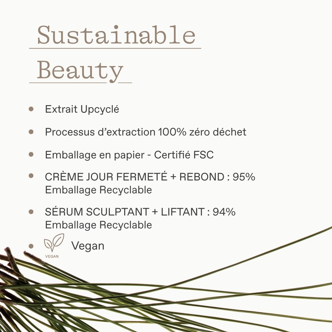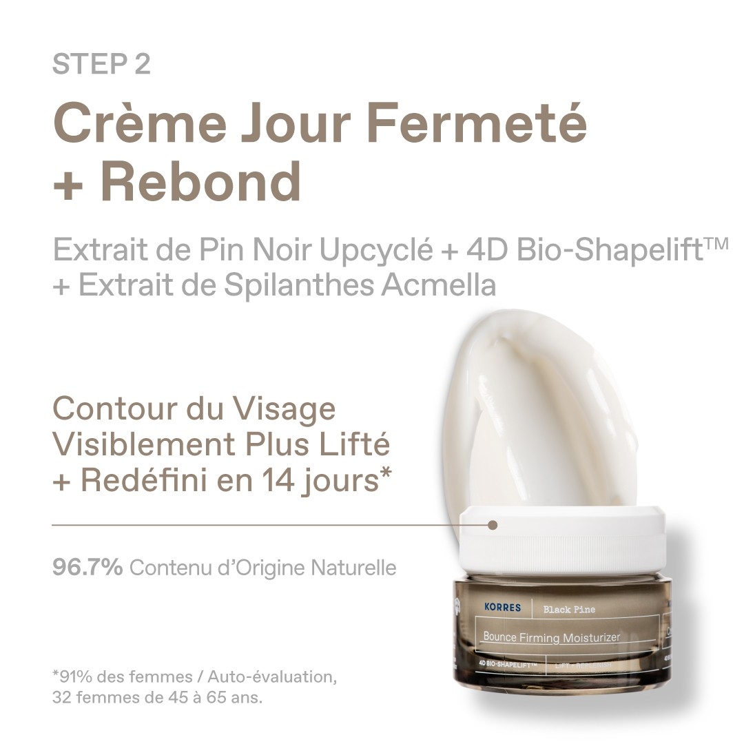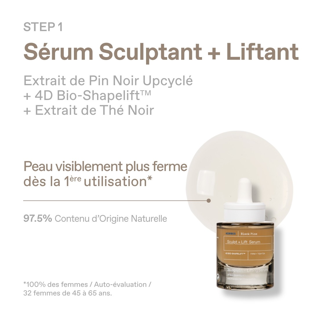 EXTRAIT DE PIN NOIR UPCYCLÉ – Riche en polyphénols, renforce la peau, améliore l’apparence de la fermeté, des rides et ridules TECHNOLOGIE 4D BIO-SHAPELIFT™ – Complexe Peptide Biomimétique (3 acides aminés) + Actif Marin. Lifte et raffermit visiblement l’apparence des contours et l’ovale du visage