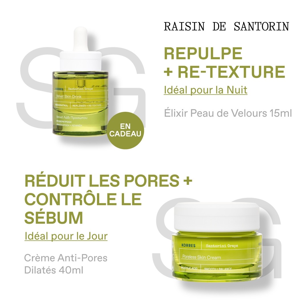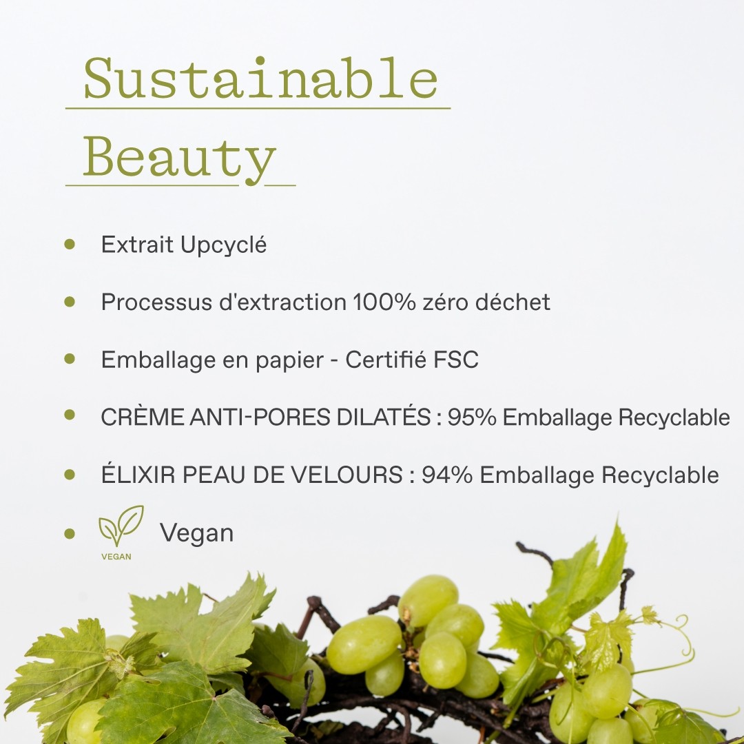 Notre Duo Expert de soins Perfecteurs de Peau formulés à base d’Extrait de Raisin de Santorin Upcyclé riche en antioxydants et tanins, en acide salicylique pour la Crème Anti-Pores Dilatés et en Resvératrol pour l’Élixir Peau de Velours.