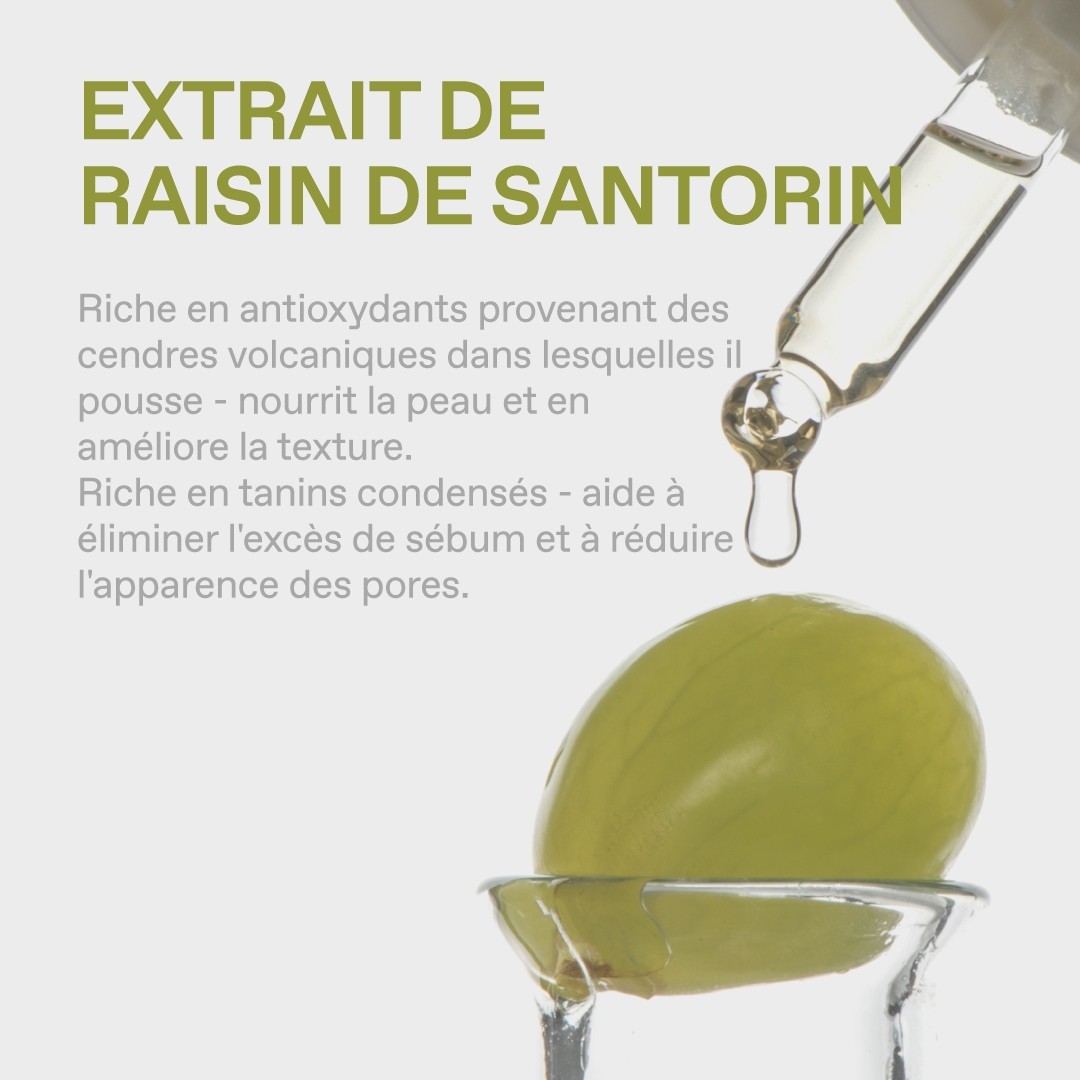EXTRAIT DE RAISIN DE SANTORIN : Nourri du sol volcanique dans lequel il pousse, riche en antioxydants et tanins, aide à éliminer l'excès de sébum et réduire l'apparence des pores.