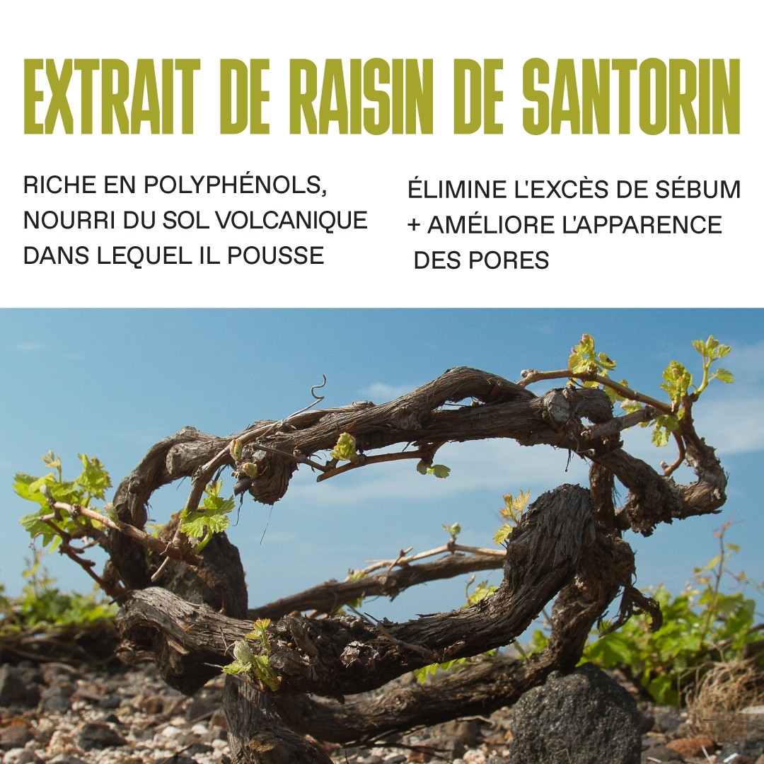 • EXTRAIT DE RAISIN DE SANTORIN : Nourri du sol volcanique dans lequel il pousse, riche en antioxydants et tanins, aide à éliminer l'excès de sébum et réduire l'apparence des pores.