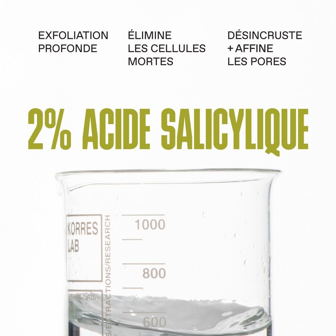 • ACIDE SALICYLIQUE 2 % : Un BHA qui exfolie la peau en douceur, désobstrue les pores et affine le grain de peau.
