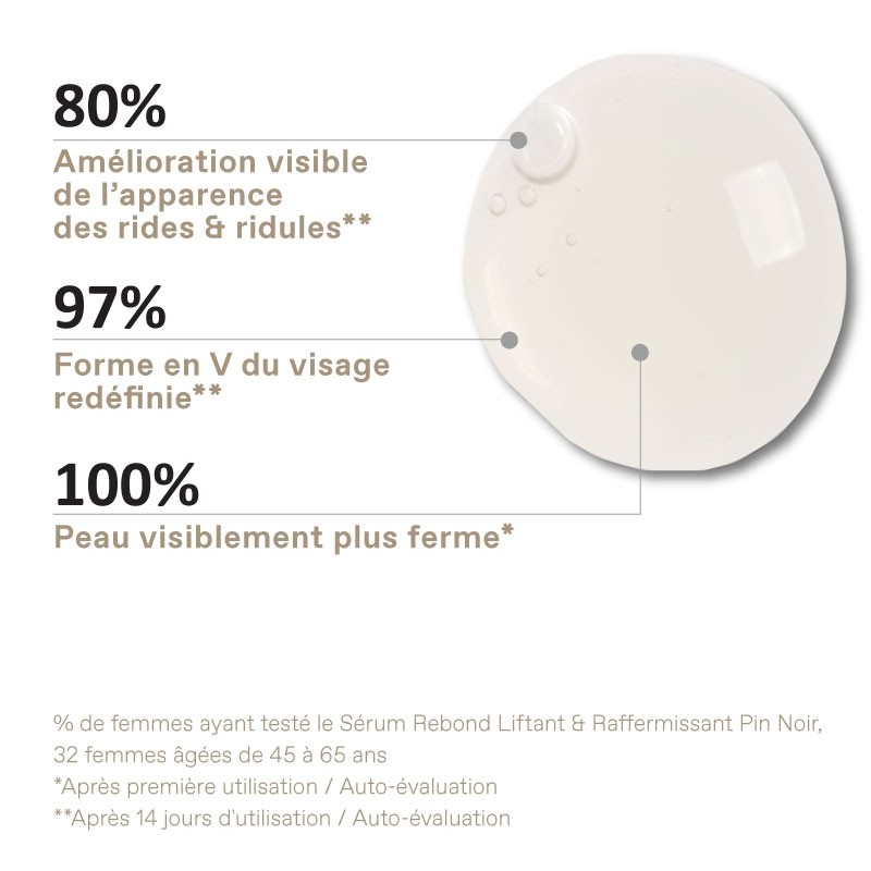 *Auto-évaluation. % de femmes ayant testé le Sérum Rebond Liftant & Raffermissant Pin Noir, 32 femmes âgées de 45 à 65 ans
