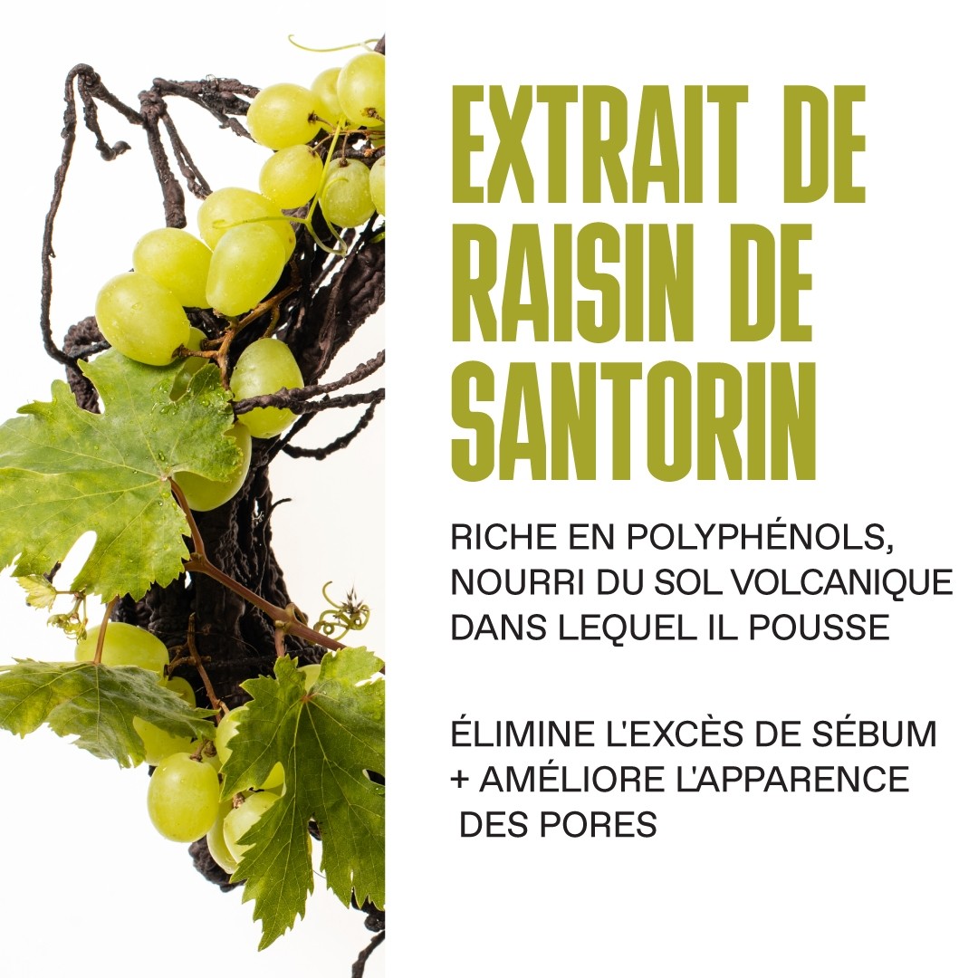 - EXTRAIT DE RAISIN DE SANTORIN : Nourri du sol volcanique dans lequel il pousse, riche en antioxydants et tanins, aide à éliminer l'excès de sébum et réduire l'apparence des pores.
