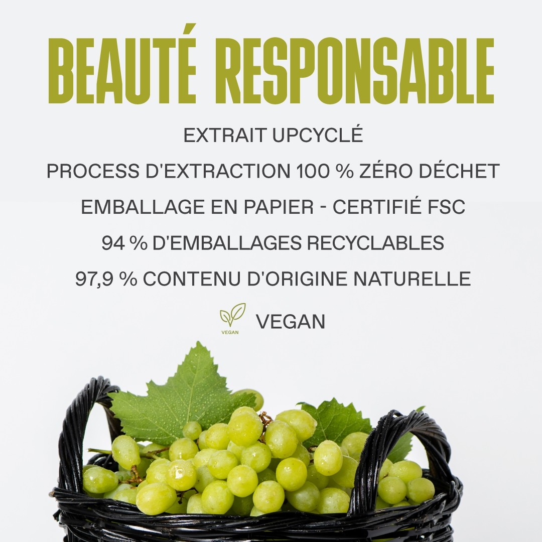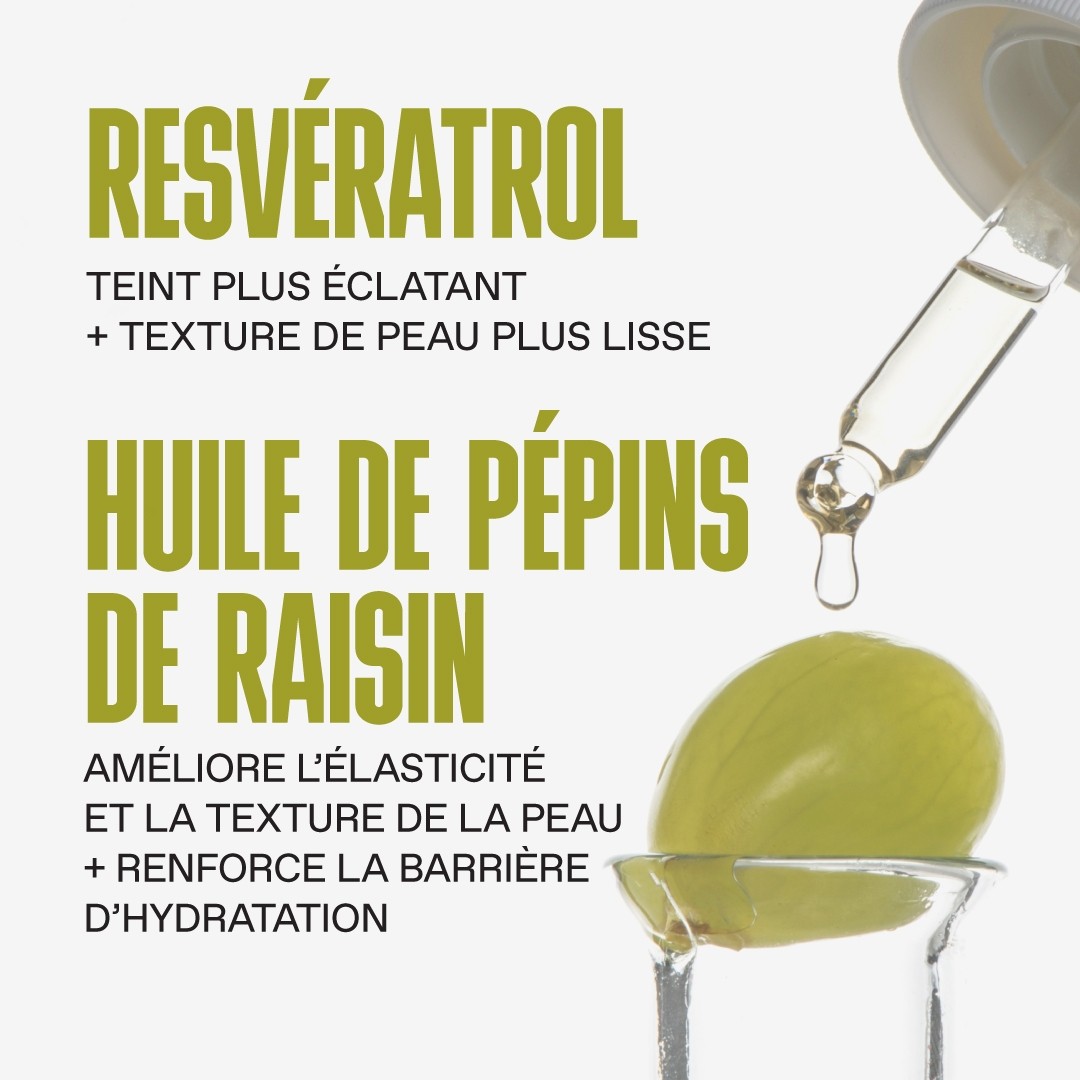 - RESVÉRATROL : Antioxydant qui se trouve naturellement dans la peau du raisin, reconnu pour ses multiples bienfaits anti-âge, illumine et lisse la texture de la peau.